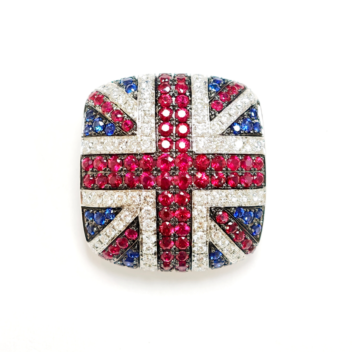 Delicate diamond pendant shaped as a curved Union Jack, exuding elegance and distinctive craftsmanship.