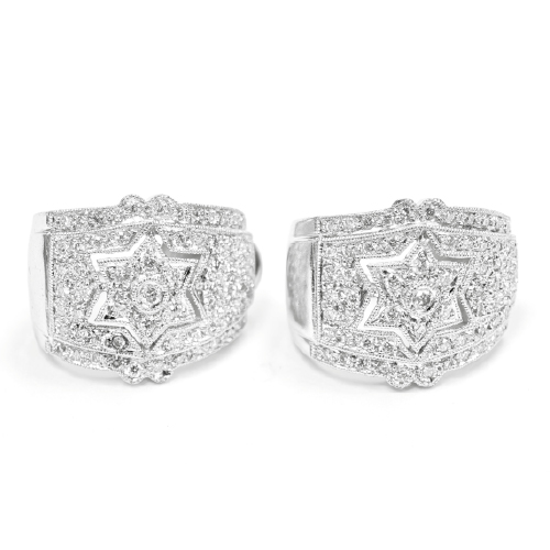 Diamond-set crest earrings—sharp, radiant, unmistakably in power.