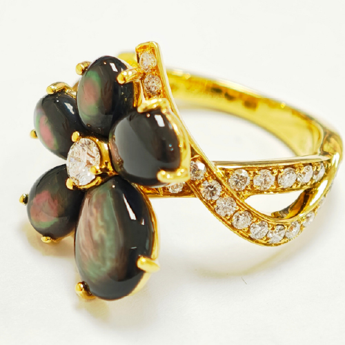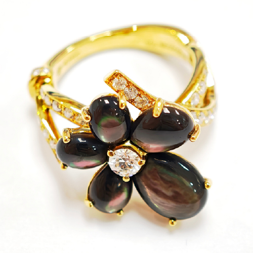 Petals of black mother-of-pearl, set in warm gold — where iridescence flows with quiet elegance.