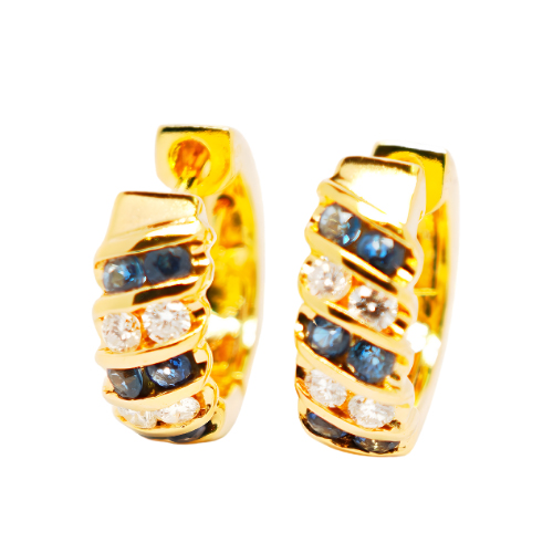 Gold hoops with sapphire and diamond accents a harmony of wisdom and brilliance.