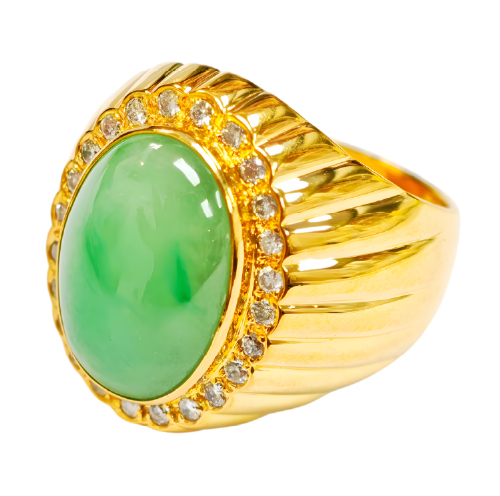 A gentle jade green rests quietly upon the finger, encircled by gold and diamond light — calm, assured, and born of presence.