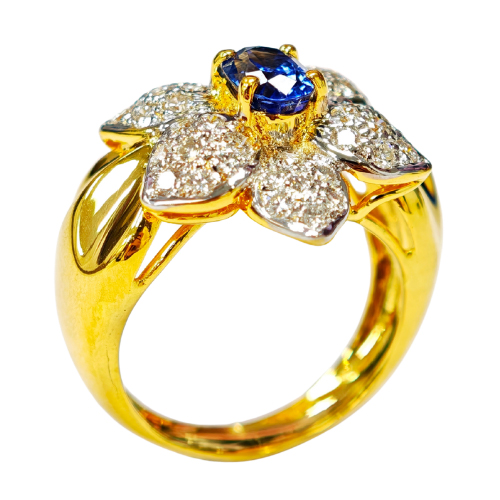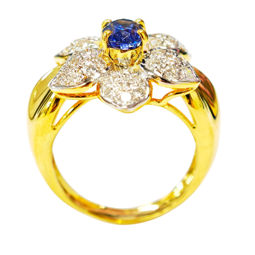 A rich blue sapphire takes center stage, with diamond petals amplifying its presence.