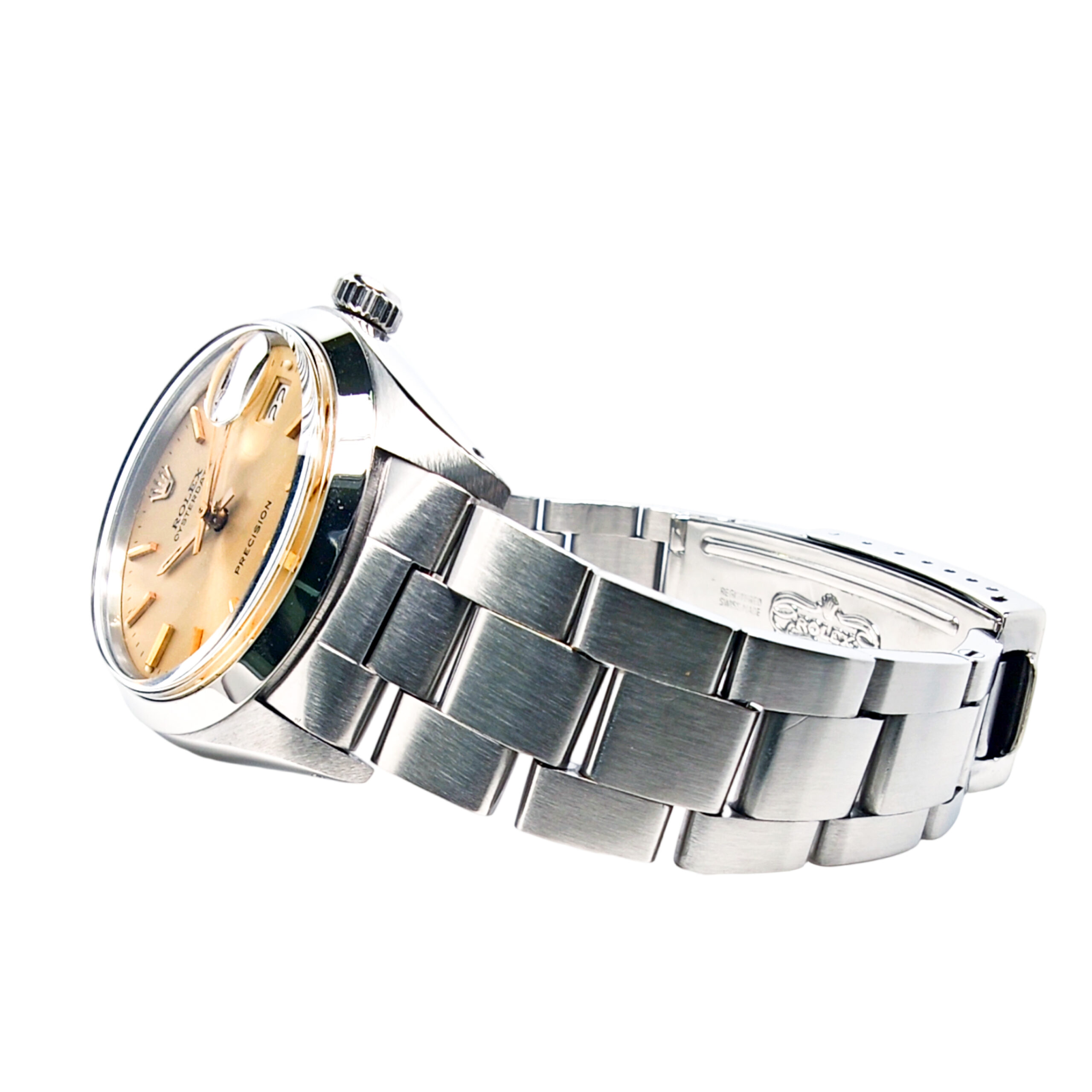 The Rolex Oysterdate Precision, referred to as the reference 6694, holds a significant historical background. Manufactured from the 1960s to the 1980s, this timepiece is renowned for its straightforwardness and practicality as an everyday wear watch. It marked one of Rolex’s final models necessitating manual winding and included a date feature first introduced around 1953. Regarded as an antecedent to the Oyster Perpetual and Air King series, the Oysterdate Precision holds a special place in Rolex’s lineage.